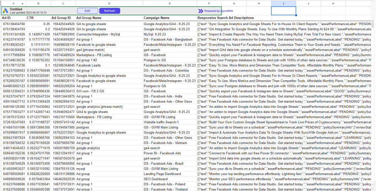 Unarguably one of the best ways to measure and optimize the CTR of all your Google ads at once is to export them to Google Sheets and set up automatic daily updates, based on which you can enhance the ad copies of your headlines and descriptions.